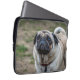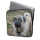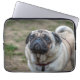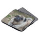 Ein nahes Foto eines niedlichen Mops-Hundes, gedruckt auf einem Laptop-Ärmel.