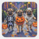 Adorable Mops, die in verspielten Halloweenkostümen gekleidet sind, tragen Kürbiseimer, während sie unter dem Mondlicht tricksen oder sich behandeln. Dieses festliche Design hebt das zerknitterte Gesicht der Rasse, die großen runden Augen und die liebliche Persönlichkeit hervor, die perfekt die sprichwörtliche und dennoch lustige Atmosphäre Halloween-Abends einfängt. Eine wunderbare Feier für Hundefreunde und Halloween-Fans gleichermaßen.