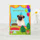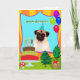 Mops-Hundealles- Gute zum Geburtstagkarte. Ein niedliches Foto des Mopshundes "alles Gute zum Geburtstag" wünschend und der Ballone im Hintergrund fügt Farben dieser schönen Geburtstagskarte hinzu.