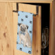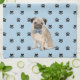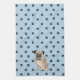 Ein hübscher kleiner Mops-Hund trägt eine Bogen-Krawatte an einem Ende dieses niedlichen Küchentüchers. Das Hundebild wird auf einem schwarzen Pfotendruck und einem hellblauen Hintergrund platziert. Ideal für alle, die ihr Herz an einem Mops verloren haben!
