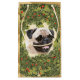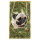 Ein niedliches Mops-Portrait, das sich auf einen Weihnachtskranz konzentriert.