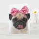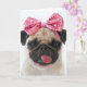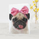 Mops Hund mit Zunge aus, mit einem rosa Band, weißem Hintergrund.