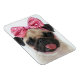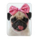 Mops Hund mit Zunge aus einem rosa Band, rosa, weißer Hintergrund.