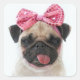 Mops Hund mit Zunge aus einem rosa Band, rosa, weißer Hintergrund.