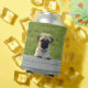 Adorable Porträtaufnahme eines Mops Welpen, der über einem Picknicktisch pinkelt.