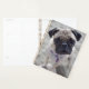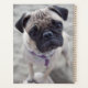 Ein Mops mit schwarzer Schrift, stehend auf dem Knie des Fotografen, der in die Kamera schaut.