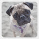 Ein Mops mit einem schwarzen Gesicht, das auf dem Knie des Fotografen stehend ist und in die Kamera schaut.