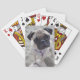 Ein Mops mit einem schwarzen Gesicht, das auf dem Knie des Fotografen stehend ist und in die Kamera schaut.