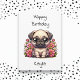 Niedlicher Chibi Cartoon Welpenhund Mops mit rosa Blume personalisierte Mädchenkarte.
