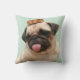 Mops Hund mit Zunge draußen und Kekse auf dem Kopf, grüner Hintergrund.