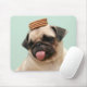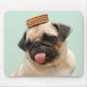 Mops Hund mit Zunge draußen und Kekse auf dem Kopf, grüner Hintergrund.