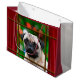 Niedlicher Kitz-Mops schaut heraus ein Fenster und begeistert aber wartet besorgt, dass Weihnachtsmann große Geschenktasche der Hundeliebhaber besucht. SEIEN SIE NICHT AUF IRGENDEINER ANDEREN GRÖSSE KORREKT