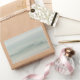 Rechteckiger Aufkleber mit pastellfarbener Landschaft mit den Silhouetten von zwei Häusern und Zypressenreihen, umgeben von nebeligen Pflücken bei einem Sonnenaufgang am frühen Morgen im Val d'Orcia Tal in Toskana, Italien.