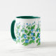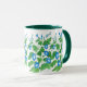 Eine hübsche Ringer-Tasse mit einem Muster von hellblauen Morning Glory-Blume und einem dunkelgrünen Rand und Griff, aus einem Aquarelldesign von Judy Adamson.