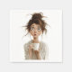 Das Bild zeigt eine skurrile, übertriebene Cartoon-Darstellung einer Frau mit weiten, erschreckten Augen, tousalem Haar in einem unordentlichen Knochen und Sommersprossen. Sie sieht entmutigt und verwirrt aus, hält eine weiße Kaffeemaschine in beiden Händen und trägt dabei eine leichte Tasse mit Blumenmuster. Ihr Ausdruck deutet darauf hin, dass sie entweder schockiert oder überwältigt ist, möglicherweise nachdem sie gerade geweckt oder einen chaotischen Moment erlebt hat. Die übertriebenen Merkmale, vor allem ihre großen Augen und ihr dünnes, ausdrucksvolles Gesicht, verleihen der Szene einen humorvollen und relativierenden Ton.
