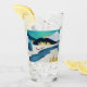 Eine digitale Landschaft mit hellen Farben und Texturen, die einen Musher mit einem Hundeschlittenteam zeigt, und einem leuchtend rosa Sonnenaufgang in den Farbtönen Blau, Gold, Cyan und Gelb.