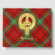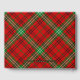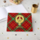 Clan Morrison Wappen Abzeichen umgeben von einem Gurt und Schnallen über rot Tartan Hintergrund. Benutzerdefinierter Vorder-, Rücken- und Rückentext.