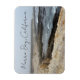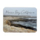 A foggy overcast day in Morro Bay California with the ocean waves hitting the rocks on the shore in this beach photograph souvenir. This seaside travel photo keepsake magnet gift features black cursive script above the beach rocks and grey sky.