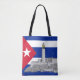 Eine Illustration der Burg Morro in Havanna. Ein Leuchtturm steht und der Eingang des Hafens von Havanna. Das ist der Hintergrund unter der Flagge Kubas.