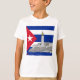 Eine Illustration der Burg Morro in Havanna. Ein Leuchtturm steht und der Eingang des Hafens von Havanna. Das ist der Hintergrund unter der Flagge Kubas.