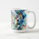 Das Bild ist ein buntes Mosaikwerk mit einem komplizierten Muster wirbelnder Formen und Linien. Die Farbpalette umfasst Blau, Grün, Gelb, Orange und Rot und verleiht so einen lebendigen und dynamischen visuellen Effekt. Die Mosaikstücke sind so angeordnet, dass sie ein fließendes, fast blumenähnliches Muster mit kreisförmigen und spiralförmigen Elementen bilden. Das Kunstwerk ist aufgrund seiner Komplexität und der harmonischen Farbmischung visuell faszinierend.