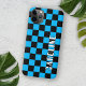 Spaß funky schwarz und hellblau farbene Rennfahnen Karo Muster Design. Mit Raum zum Personalisieren oder anpassen mit einem Namen Ihrer Wahl in Weiß und Schwarz. Funky, elegant, stilvoll und eklektisch für die extravagante künstlerische Mode, die künstlerische Modediva, der beliebte angesagte Trendsetter, Vintager Retro-Kunststil und abstrakter, geometrischer Motiv-Liebhaber, der will, ihr Handy vor Staub und Schmutz, Verschleiß und Tränen zu schützen. Dieses Design ist für Apple iPhone 6, 7, und 8 Plus, 10 oder X, XR, XS, 11, 12, 13 Mini, 14, 15 Plus und Pro Max Handy Hüllen erhältlich. Zeigen Sie Ihren Stil, sehen Sie modern aus und fühlen Sie sich stilvoll mit einem einzigartigen Design auf einem mobilen Zubehör Ihrer Wahl.