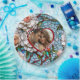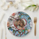 Personalisierte Probe Abendessen oder Hochzeitsempfang Teller mit Braut und Bräutigam's Initialen, Hochzeitstag und Foto. . Eine wunderschöne Illustration, die ein Mosaik aus Buntglas und Fliesen aus Korallenbänken mit blauen und anderen farbenfrohen Akzenten nachahmt.