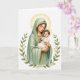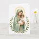 This design shows a gentle scene of a woman in flowing sage-green drapery with tiny gold touches, holding a small child close against a bright white background. Her head tilts down with a tender, caring look, and the child’s relaxed posture suggests trust and closeness like a quiet moment between dear companions. A soft golden glow forms a halo-like ring around both figures, adding warmth without crowding the open space. The child wears simple white clothing with rosy cheeks, and the skin tones are shaded softly for a calm, intimate look. Near the top, a short greeting sits centered in small gold lettering, leaving plenty of airy white space around it. Along the bottom edge, a low garland of green leaves and small white flowers 🌷 frames the figures like a natural border. Fine folds in the fabric and gentle highlights guide your eye from the woman’s shoulder down toward the child’s face 🐇. The greenery at the base includes layered fern-like leaves dotted with tiny white blossoms.