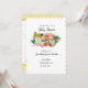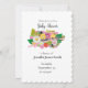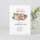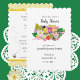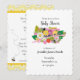 Baby shower invitation with a "mother-to-bee" theme. It's designed with a scrapbook style collage of bees, berries and flowers for a cute retro vibe in pinks and yellows. All text is pre-formatted front and back and ready for your own details.