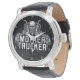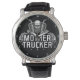 This edgy wall clock proudly declares the "Mother Trucker" title with a bold design. Against a black background with a pink rim, it features a stylized white skull wearing a cap, flanked by exhaust pipes and truck tires. The distressed "MOTHER TRUCKER" text adds to its fierce aesthetic, making it a spirited gift for a confident female truck driver. The design tool can also be used to add custom text if you want your name or company on this clock. You can customize the color of the frame to any color you desire by going into the design tool.