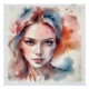 Aquarelle Stil mit einem Portrait von Frau. Es ist ein bemaltes Gesicht mit sanften und fließenden Farben, die sich gegenseitig schmelzen. Die vorherrschenden Töne sind Blutergüsse, Rote, Orangen und Flecktöne, die einen Äthereffekt und Träumer hervorbringen. Das Porträt hat einen intensiven Blick und einen einleuchtenden Ausdruck. Die verwendete Technik vermittelt einen Eindruck von Feingefühl und Fließfähigkeit, typisch für das zeitgenössische Aquarelle.