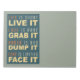 "Das Leben ist kurz - LIVE IT, Liebe ist selten - GRAB IT, Wut ist schlecht - DUMP IT, Angst ist limitierend - FACE IT". Sehen Sie in meinem Laden nach Artikeln mit diesem Design.