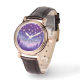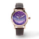 Schöne Armbanduhr in lila und rosa Farbtönen mit einer Naturszene mit Sternenhimmel als Motiv. Der Text lautet "Für die Sterne erreichen" und Sie können den Text natürlich in etwas Anderes, wie einen Namen, ändern, um persönlich zu sein.