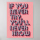 Motivierend Zitat "Wenn du es nie versuchst, wirst du es nie wissen" in Rosa und Pflaume.