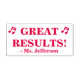Dieses ermutigende Design der Gummi Briefmarke beinhaltet die Motivationsbotschaft "GROSSE ERGEBNISSE!" und einen personalisierten Tutor-Namen. Es gibt auch dekorative Noten. Es könnte von einem Lehrer, Pädagogen oder Tutor verwendet werden, um zu bestätigen, dass der Schüler gut abgeschnitten hat.