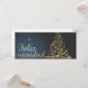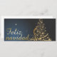 La tarjeta navideña presenta un elegante árbol de Navidad dorado formado por estrellas centelleantes sobre un fondo azul oscuro. La inscripción "Feliz Navidad" en letras curvas doradas redondea con estilo el krankño festivo. 🎄 ✨