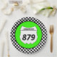 Schneiden Sie stilvoll auf Ihrem nächsten Motocross Rennen mit personalisierten Tellern. Diese Teller haben eine weiße Nummernplatte, die mit Ihrem Namen und Ihrer Fahrradnummer personalisiert werden kann. Die Nummernschild ist Set vor einem hellgrünen Hintergrund mit einer schwarz-weiß karierten Markierung.