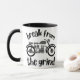 Eine Kaffeemaschine mit einem monochromen Retro-Motorrad, wobei sich der Begriff "Break from the Grind" um das Bild dreht. Das Design legt ein Gefühl von Abenteuer und Freiheit nahe und bietet eine friedliche Flucht aus dem Alltag.