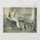 Auf dieser Postkarte befindet sich ein Vintages Foto von zwei Männern aus den 30er Jahren, ein Junge und ein Teddybär, der auf einem Motorrad steht.