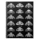 Notebook in einem Raster von detaillierten, schönen Motten in Schwarz und Weiß, mit Grau auf schwarzem Hintergrund