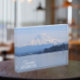 Akryllischer Foto, der ein landschaftliches, landschaftliches Foto eines majestätischen Berges Rainier und das blaue Wasser des Puget Sound, wie aus der Stadt Tacoma, Washington, zu sehen ist. Ein tolles Reise-Souvenir und Geschenk!