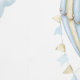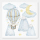 Wasserfarbenes Kaninchen in einem Heißluftballon, der im Himmel über den blauen Bergen treibt, Wolken, Mond und Sterne für Baby-Junge-Kinderzimmer.