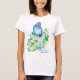 Ein T - Shirt, der mit einem Bluebird aus dem Gebirge auf einer Syringa dekoriert ist, ein mockorangefarbener, mit Aquarell bemalter Busch. Das Design wird von der Staat Vogel und Staat Blume für Idaho inspiriert.