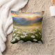 Weiße, sonnige Wiese mit Bergkulisse bei Sonnenaufgang.