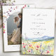The back features a modern boho arch photo template framed by delicate wildflower accents, allowing you to showcase a favorite engagement picture with bohemian flair. This blend of scenic landscape art and personalized photography creates a stunning first impression for your guests. Whether you are marrying in a national park or a local garden, this nature-inspired card sets a romantic, organic tone for your upcoming wedding day.