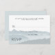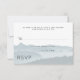 Hochzeitskarten für Hochzeitskappen mit individuellem Text. Fügen Sie eine Zeile ein, um Gäste für eine genaue Anzahl fragen, wenn Sie möchten, oder entfernen Sie sie und schreiben Sie sie, wie Sie möchten. Blau, grau und weiß, mit mickrigen Berglandbildern.