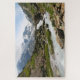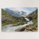 Hübsches landschaftliches Landschaftsjigsaw-Puzzle mit einem schönen schneebedeckten Berg und Bach.