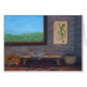 Mountain Window - eine gestreifte Katze spielt mit roten Paprikaschoten unter einem bunten Bergpanorama - aus einem Acrylgemälde von M Rogers.