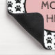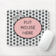 Ein Mauspad mit Katzenverstecken und gewartet, um die Maus in der Mitte zu platzieren, wo es "PUT MOUSE HERE" steht. Im Hintergrund ist ein Muster von Pfoten. Text, Bilder und Farben können alle geändert werden. Es ist vollständig anpassbar.