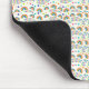 Mouse pad with a pattern of diverse smiley faces in multiple colors, creating a playful and cheerful atmosphere. Below, a white mouse rests on it.